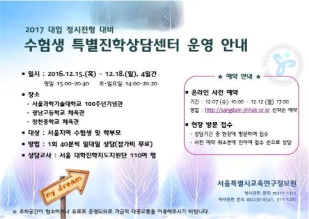 12.15.(¸ñ)~18.(ÀÏ) ¼¿ï°ú±â´ë¡¤±¤³²°í¡¤Ã¢ÃµÁß 3°÷, 110¸í ÁøÇÐÀü¹®°¡ »ó´ã ¼¿ï½Ã±³À°Ã»(±³À°°¨ Á¶Èñ¿¬) »êÇÏ ±³À°¿¬±¸Á¤º¸¿ø(¿øÀå À̹Îö)Àº 12¿ù 15ÀÏ(¸ñ)ºÎÅÍ 18ÀÏ(ÀÏ) ..